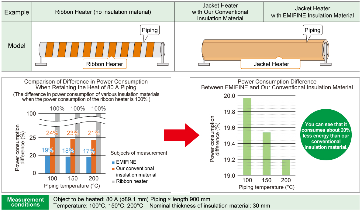 The difference in power consumption between using a ribbon heater (without insulation), a jacket heater using our conventional insulation, and a jacket heater using high performance Emifine insulation for the purpose of keeping 80A piping warm is shown below.